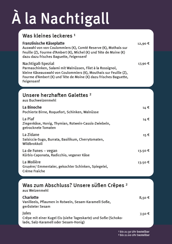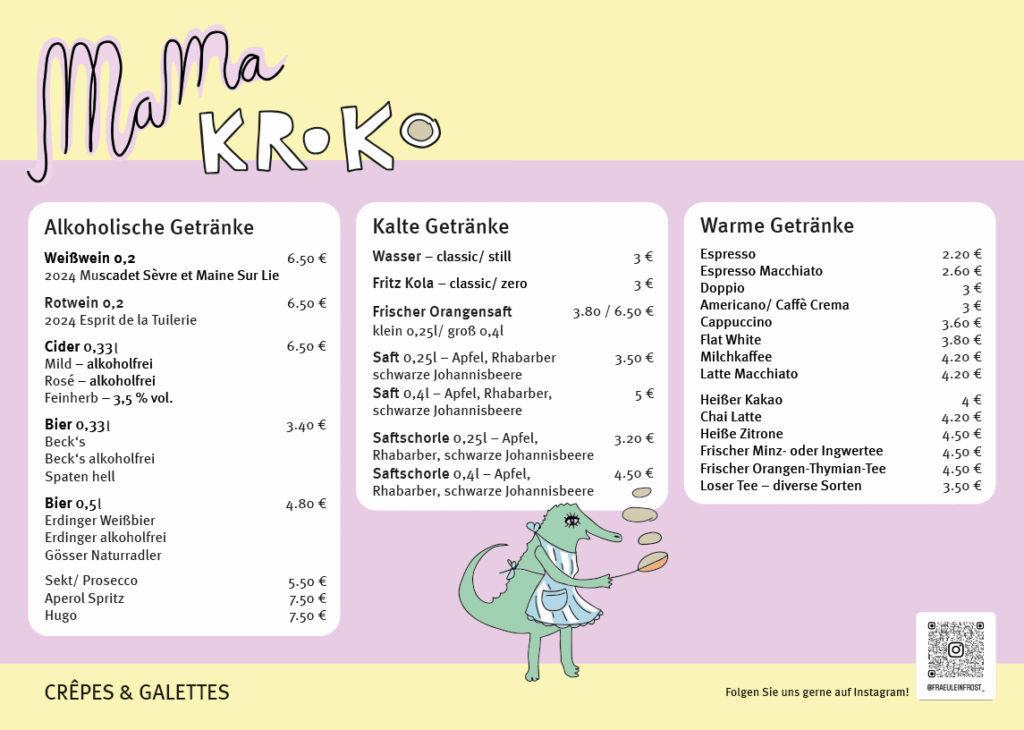 Kommt also rum ins Fräulein Frost. Neben leckeren Bier, gutem Wein, ausgewählten Cocktails gibt es auch Galettes, Crêpes, eine Käse- und Nachtigallplatte.